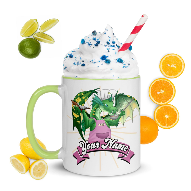 Zeige allen wer die Küche beherrscht mit dieser stylischen Tasse! Bedruckt mit einem Drachen in passender Kochschürze und Mütze - und passend dazu mit bunter Innenfarbe deiner Wahl, ist diese Tasse ein wahrer Hingucker und die perfekte Ergänzung für deinen Tassenschrank.
